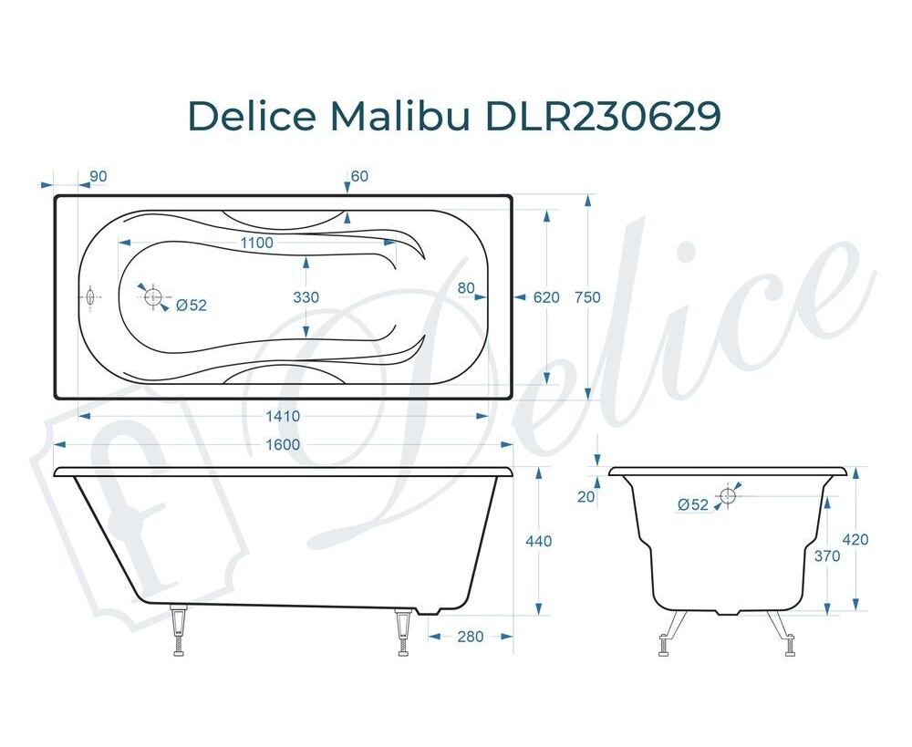 Для установки используются фирменные ножки Delice, которые имеют надежное и прочное крепление, обеспечивают высокую устойчивость ванны и регулируются по высоте. Высота на ножках варьируется от 55 до 59.5 см. Ножки выполнены из высокопрочного чугуна марки СЧ25, который выдерживает большие нагрузки. С помощью регулировки можно нивелировать геометрические отклонения пола, стен и углов в ванной комнате. Для модели Malibu подходит комплект ножек для серии Elite - артикул DLR000033.