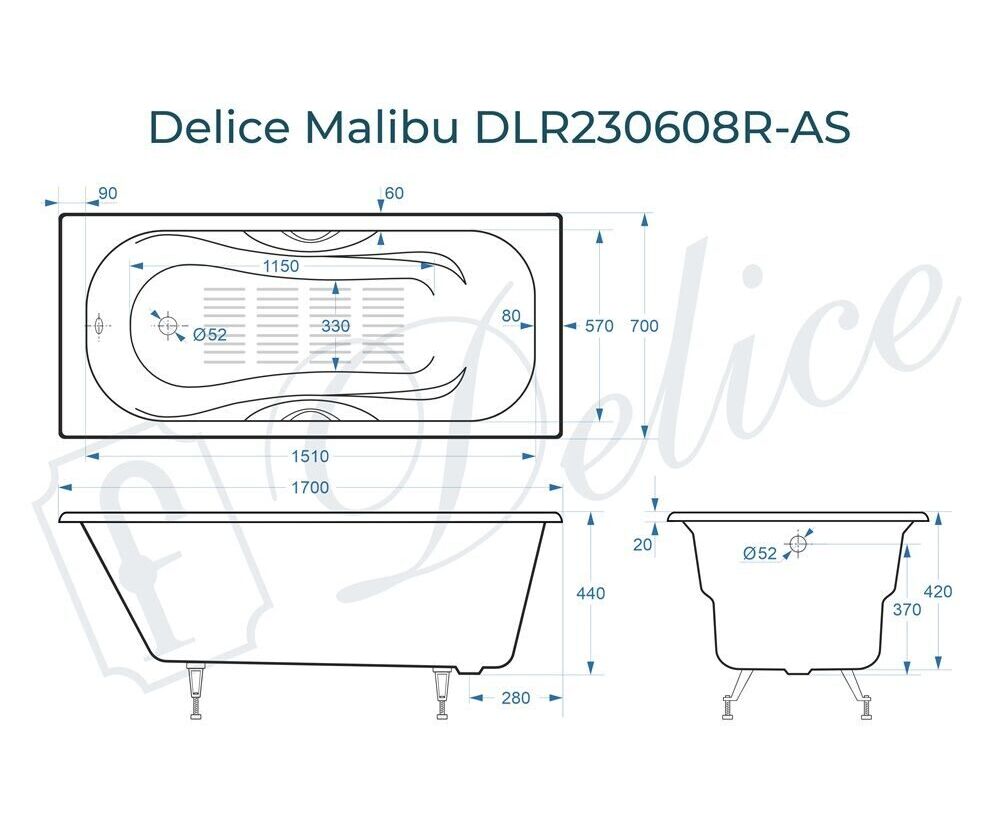 Для установки используются фирменные ножки Delice, которые имеют надежное и прочное крепление, обеспечивают высокую устойчивость ванны и регулируются по высоте. Высота на ножках варьируется от 55 до 59.5 см. Ножки выполнены из высокопрочного чугуна марки СЧ25, который выдерживает большие нагрузки. С помощью регулировки можно нивелировать геометрические отклонения пола, стен и углов в ванной комнате. Для модели Malibu подходит комплект ножек для серии Elite - артикул DLR000002.