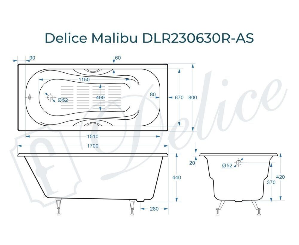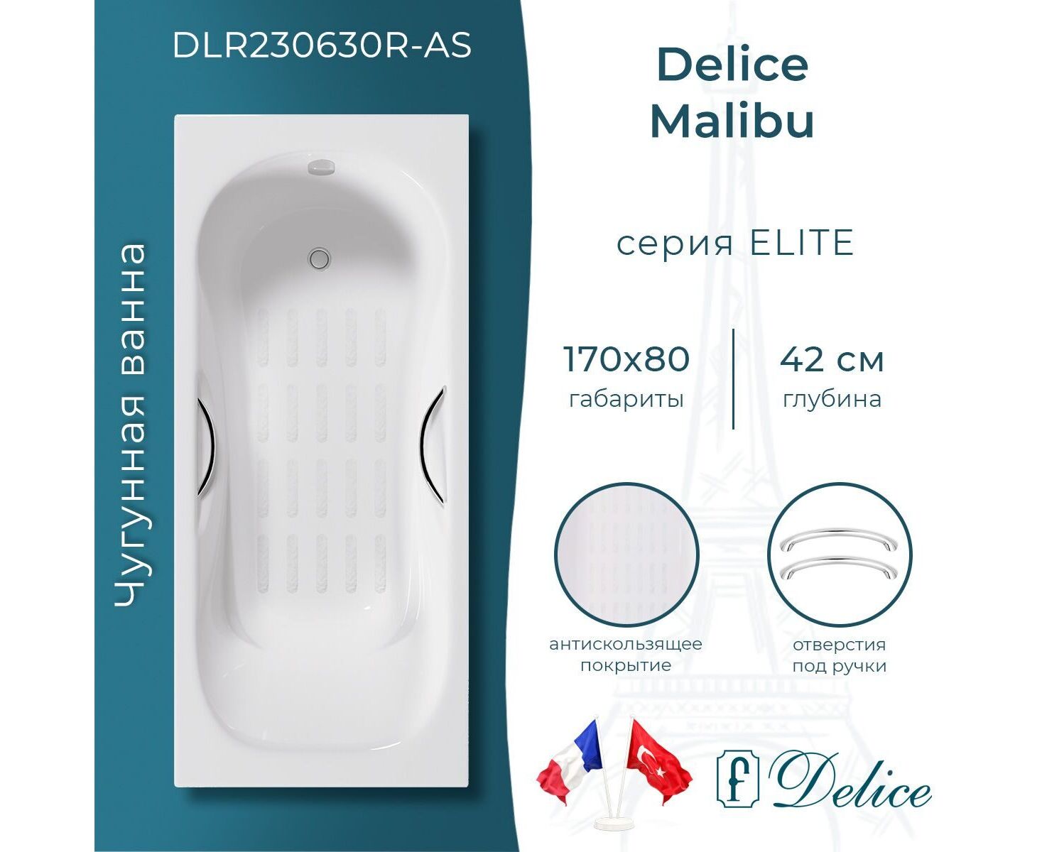 Описание чугунной ванны Delice Malibu 170х80 с отверстиями под ручки и антискользящим покрытием