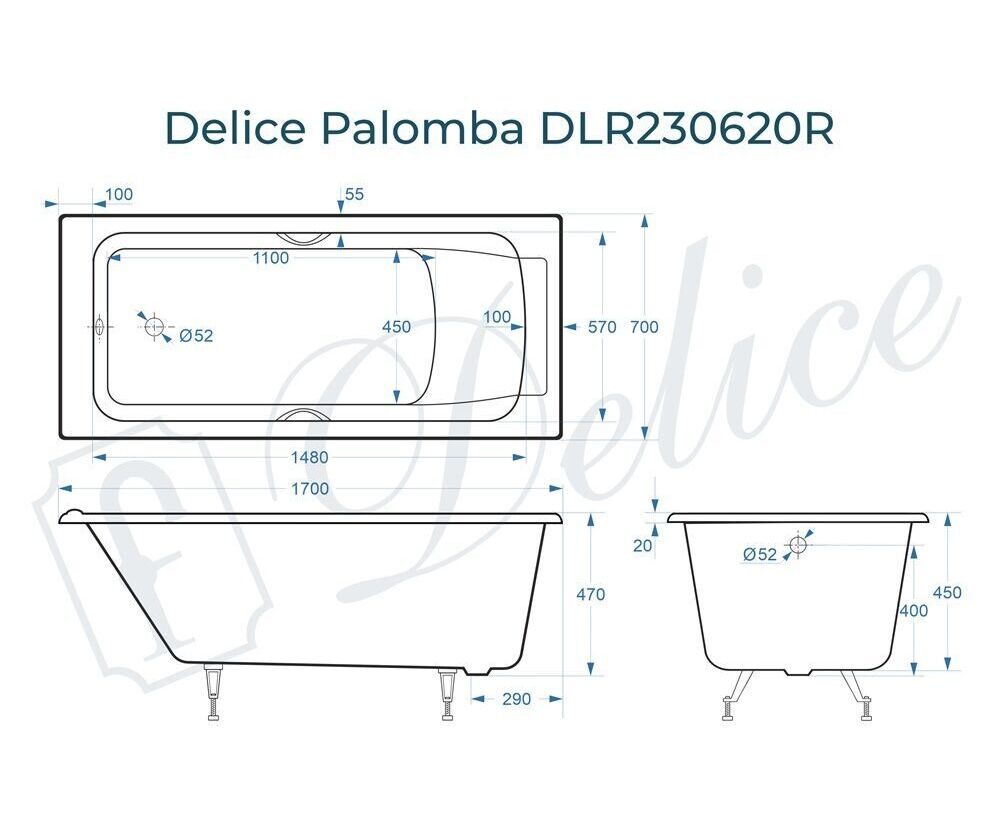 Для установки используются фирменные ножки Delice, которые имеют надежное и прочное крепление, обеспечивают высокую устойчивость ванны и регулируются по высоте. Высота на ножках варьируется от 58 до 62.5 см. Ножки выполнены из высокопрочного чугуна марки СЧ25, который выдерживает большие нагрузки. С помощью регулировки можно нивелировать геометрические отклонения пола, стен и углов в ванной комнате. Для модели Palomba подходит комплект ножек для серии Elite - артикул DLR000002.
