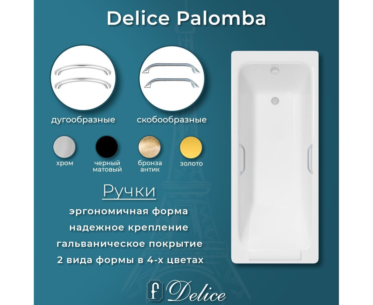 Для увеличения комфорта и удобства при использовании ванны модель оснащена отверстиями под ручки, вы можете выбрать подходящий вариант ручек по дизайну и цвету: полукруглые (дугообразные) или квадратные (скобообразные). Каждый вариант выпускается в 4-ех цветах: хром, черный матовый, золото и античная бронза. Ручки для ванны имеют эргономичную удобную форму, стойкое гальваническое покрытие и стильный дизайн. Надежное крепление гарантирует длительный срок эксплуатации. С помощью ручек удобно заходить и выходить из ванны, а также вставать и садиться.
