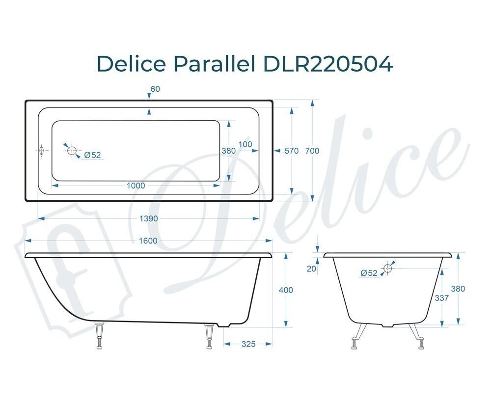 Для установки используются фирменные ножки Delice, которые имеют надежное и прочное крепление, обеспечивают высокую устойчивость ванны и регулируются по высоте. Высота на ножках варьируется от 52.5 до 58 см. Ножки выполнены из высокопрочного чугуна марки СЧ25, который выдерживает большие нагрузки. Для модели Parallel подходят ножки для серии Comfort (артикул DLR000001).