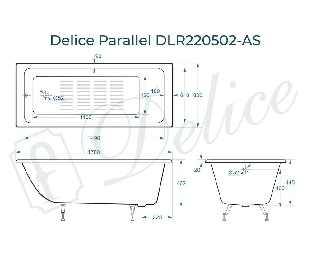 Для установки используются фирменные ножки Delice, которые имеют надежное и прочное крепление, обеспечивают высокую устойчивость ванны и регулируются по высоте. Высота на ножках варьируется от 59.5 до 64.5 см. Ножки выполнены из высокопрочного чугуна марки СЧ25, который выдерживает большие нагрузки. Для модели Parallel подходят ножки для серии Comfort (артикул DLR000001).
