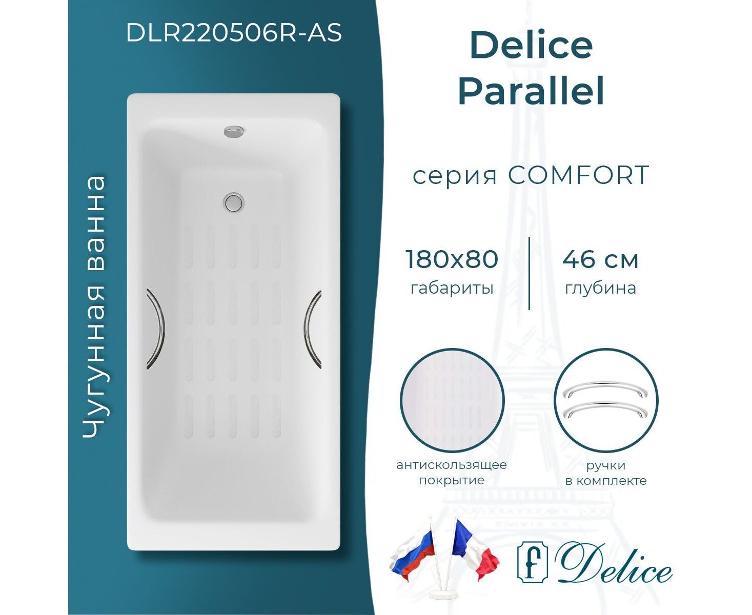Чугунная ванна Delice Parallel 180х80 с ручками и антискользящим покрытием - стильная современная модель чугунной ванны прямоугольной формы. Ванна выполнена в размере 180х80 см с глубиной 46 см. Модель идеально подойдет для ванной комнаты квартире или доме и впишется в любой стиль дизайна от классического до лофт. Прямые линии формы подчеркивают идеальную геометрию ванны, а широкое дно и расширенная чаша создают комфорт при использовании. Ванна очень удобна за счет правильной формы, увеличенной ширины (80 см) и глубины (46 см), в ней комфортно может разместиться человек любой комплекции. Анатомическая форма чаши способствует правильному расположению человека в ванной, обеспечивая максимальный релакс и расслабление мышц.