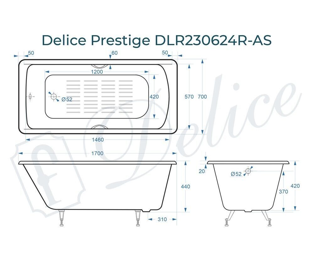 Для установки используются фирменные ножки Delice, которые имеют надежное и прочное крепление, обеспечивают высокую устойчивость ванны и регулируются по высоте. Высота на ножках варьируется от 55 до 59.5 см. Ножки выполнены из высокопрочного чугуна марки СЧ25, который выдерживает большие нагрузки. С помощью регулировки можно нивелировать геометрические отклонения пола, стен и углов в ванной комнате. Для модели Prestige подходит комплект ножек для серии Elite - артикул DLR000033.