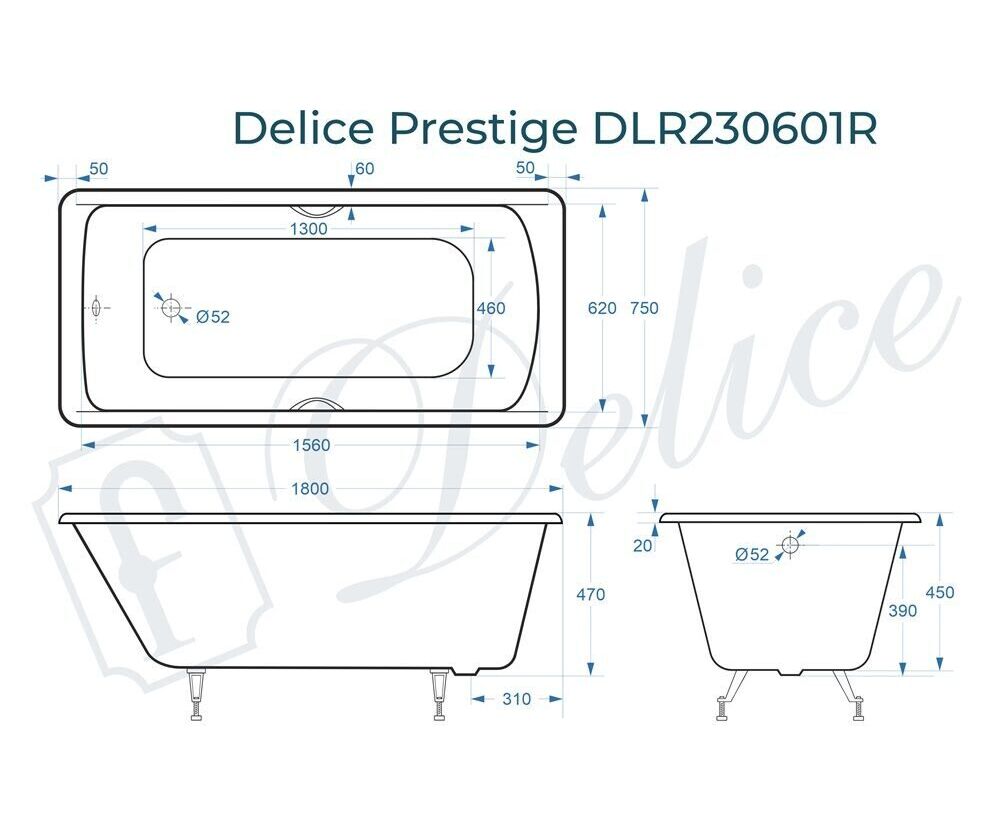 Для установки используются фирменные ножки Delice, которые имеют надежное и прочное крепление, обеспечивают высокую устойчивость ванны и регулируются по высоте. Высота на ножках варьируется от 58 до 62.5 см. Ножки выполнены из высокопрочного чугуна марки СЧ25, который выдерживает большие нагрузки. С помощью регулировки можно нивелировать геометрические отклонения пола, стен и углов в ванной комнате. Для модели Prestige подходит комплект ножек для серии Elite - артикул DLR000002.