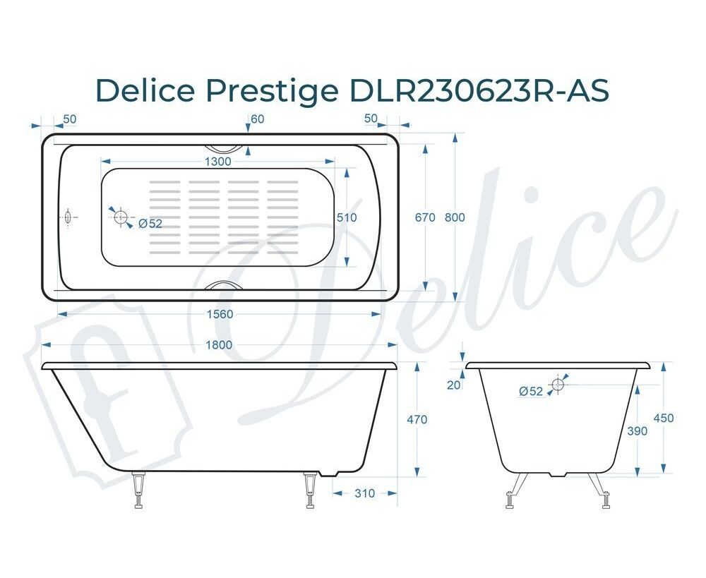 Для установки используются фирменные ножки Delice, которые имеют надежное и прочное крепление, обеспечивают высокую устойчивость ванны и регулируются по высоте. Высота на ножках варьируется от 58 до 62.5 см. Ножки выполнены из высокопрочного чугуна марки СЧ25, который выдерживает большие нагрузки. С помощью регулировки можно нивелировать геометрические отклонения пола, стен и углов в ванной комнате. Для модели Prestige подходит комплект ножек для серии Elite - артикул DLR000033.