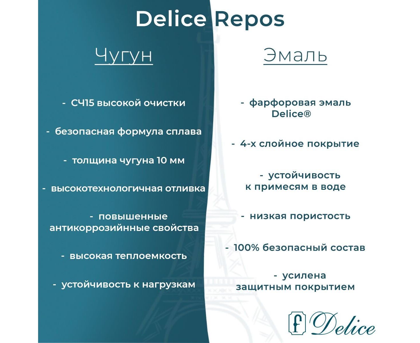 Для установки используются фирменные ножки Delice, которые имеют надежное и прочное крепление, обеспечивают высокую устойчивость ванны и регулируются по высоте. Высота на ножках варьируется от 59.5 до 64.5 см. Ножки выполнены из высокопрочного чугуна марки СЧ25, который выдерживает большие нагрузки. Для модели Repos подходит комплект ножек для серии Comfort.