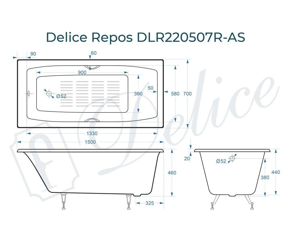 Описание чугунной ванны Delice Repos 150х70 с ручками и антискользящим покрытием