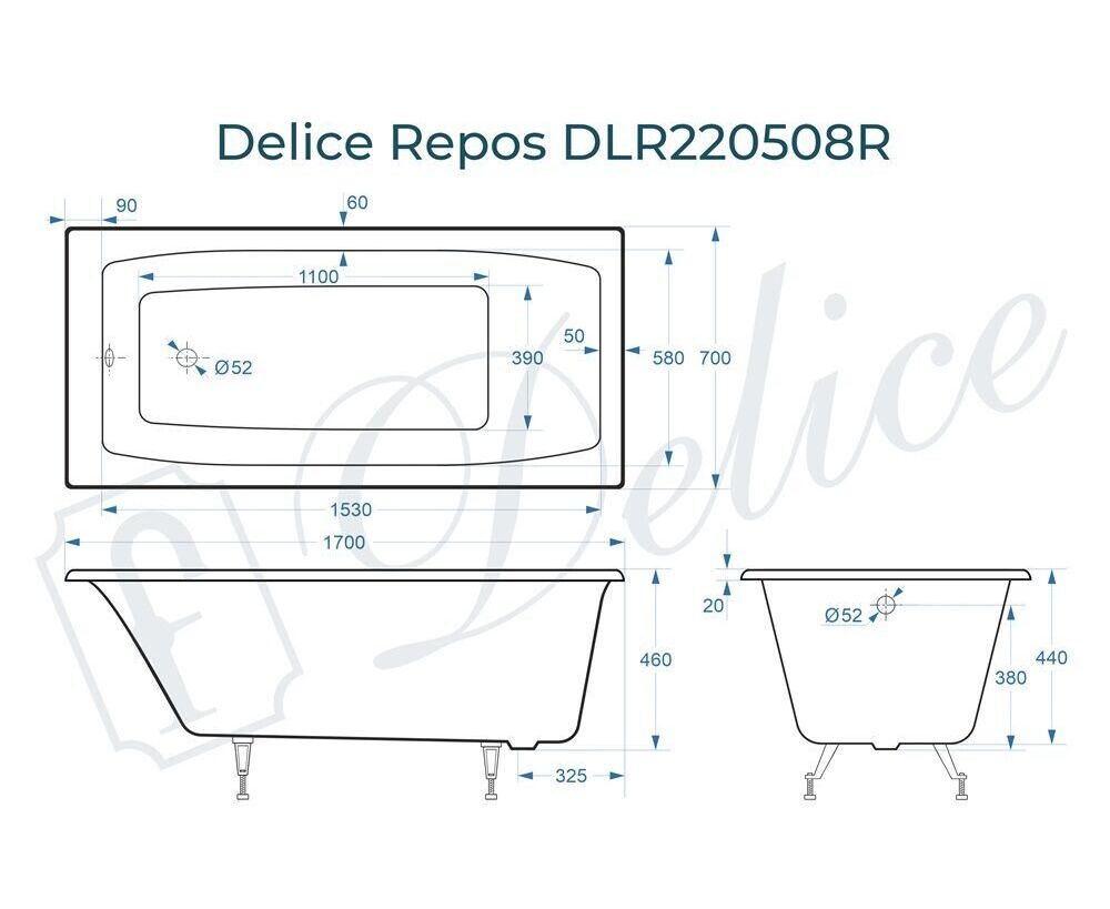Для установки используются фирменные ножки Delice, которые имеют надежное и прочное крепление, обеспечивают высокую устойчивость ванны и регулируются по высоте. Высота на ножках варьируется от 59.5 до 64.5 см. Ножки выполнены из высокопрочного чугуна марки СЧ25, который выдерживает большие нагрузки. Для модели Repos подходит комплект ножек для серии Comfort.