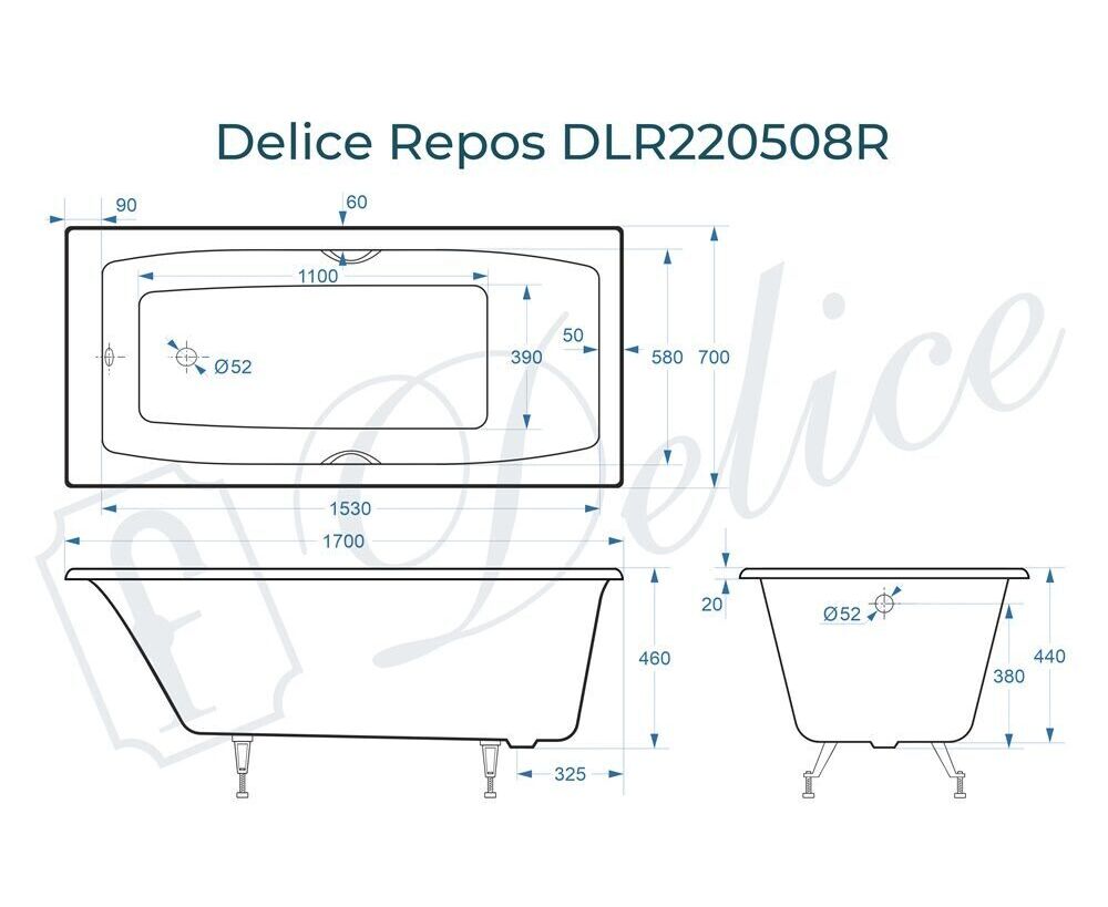 Для установки используются фирменные ножки Delice, которые имеют надежное и прочное крепление, обеспечивают высокую устойчивость ванны и регулируются по высоте. Высота на ножках варьируется от 59.5 до 64.5 см. Ножки выполнены из высокопрочного чугуна марки СЧ25, который выдерживает большие нагрузки. Для модели Repos подходит комплект ножек для серии Comfort.