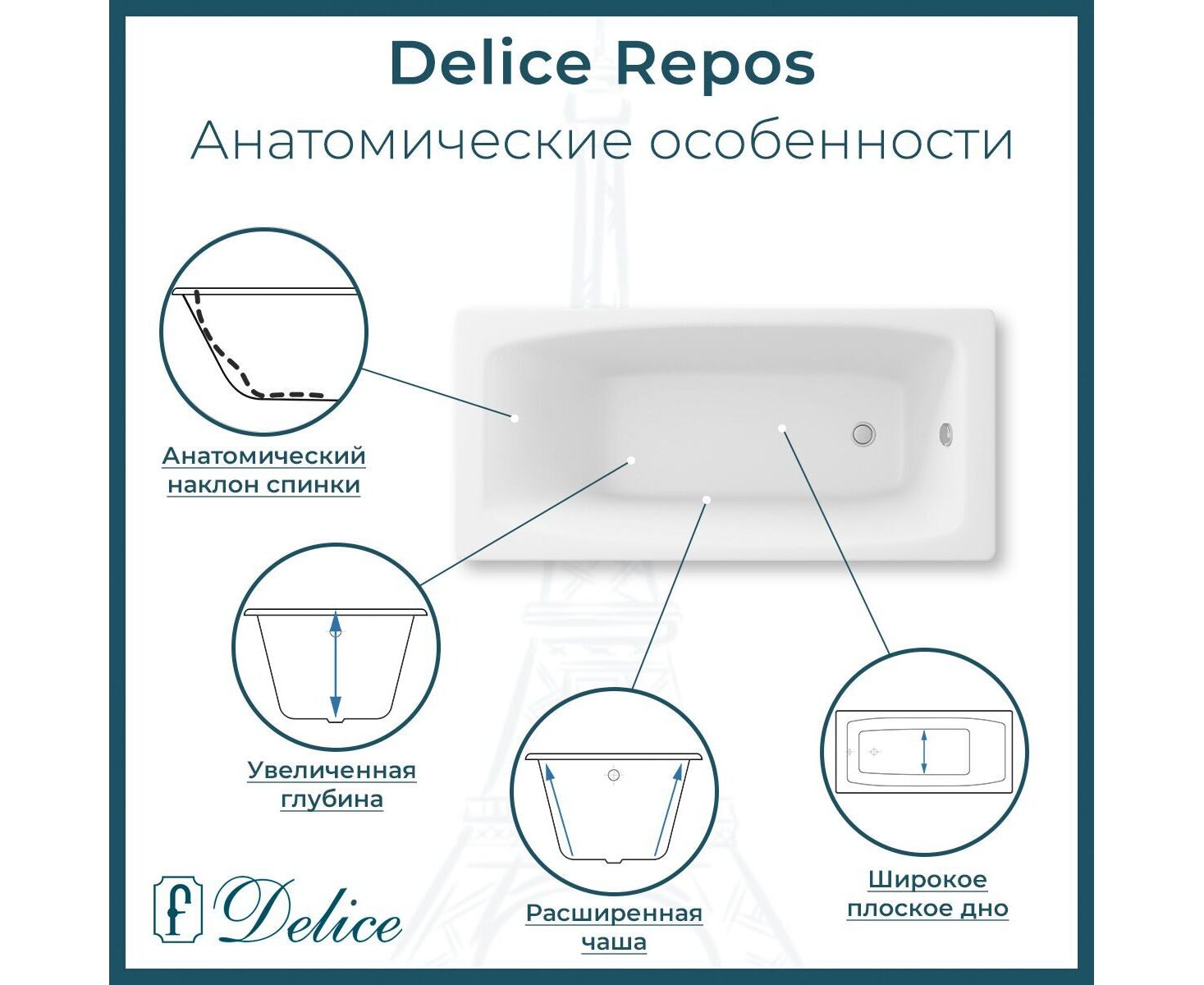 Данная модификация Delice Repos имеет противоскользящее покрытие дна, которое гарантирует безопасный и комфортный прием ванны и душа. Покрытие наносится специальным оборудованием на производстве в виде тонких полос, практически не заметно визуально и не ощущается при использовании.