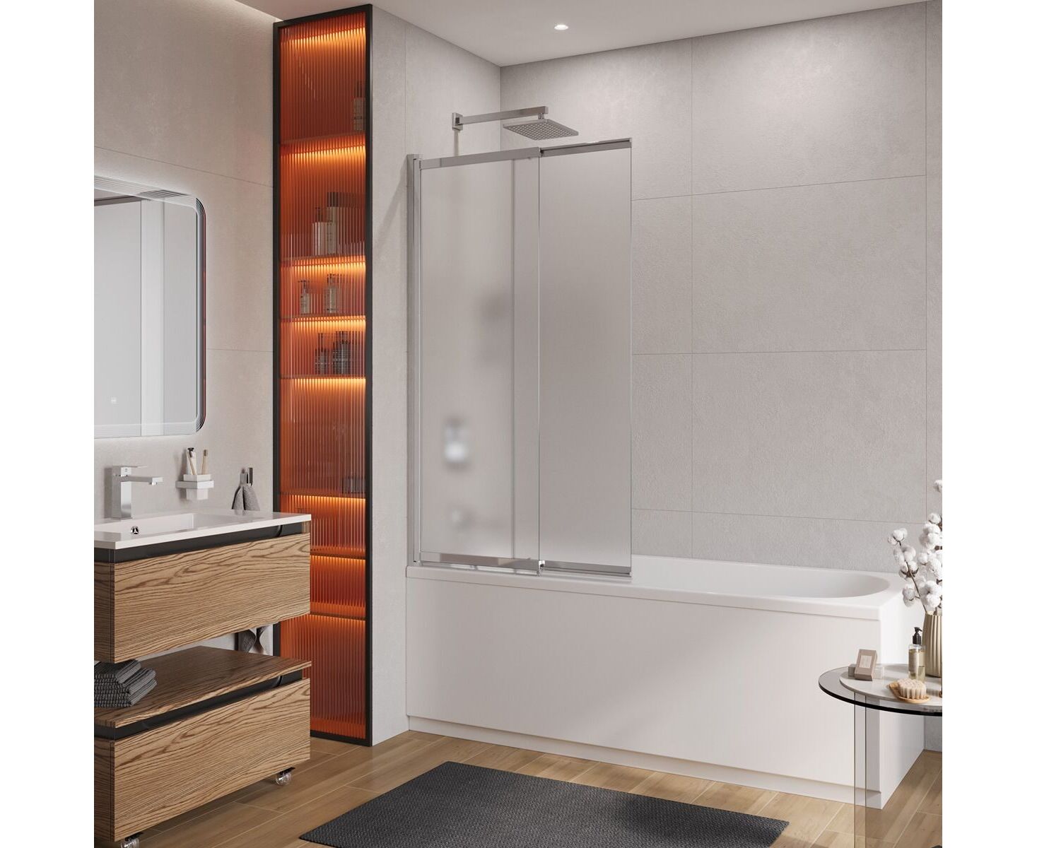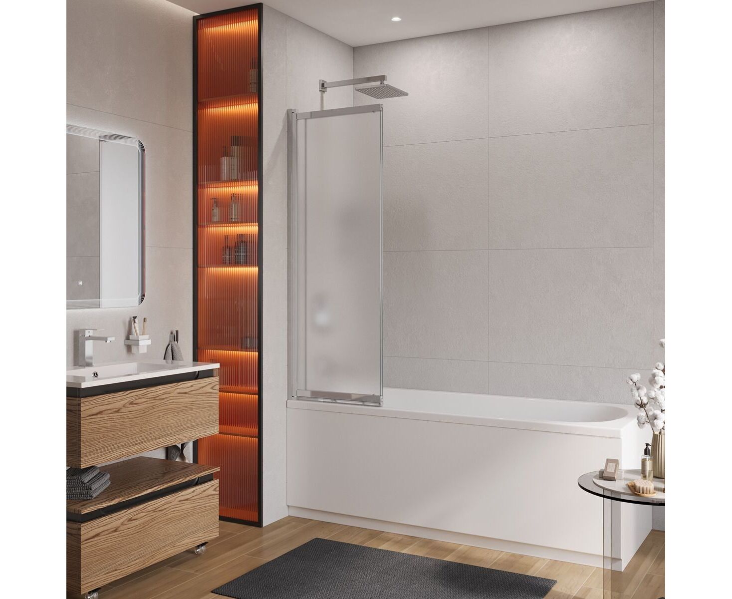 С другой стороны, шторка оснащена поворотной системой открывания на 180° , что позволяет максимально открыть пространство, упрощая уход за ванной и делая ванную комнату визуально свободнее.
