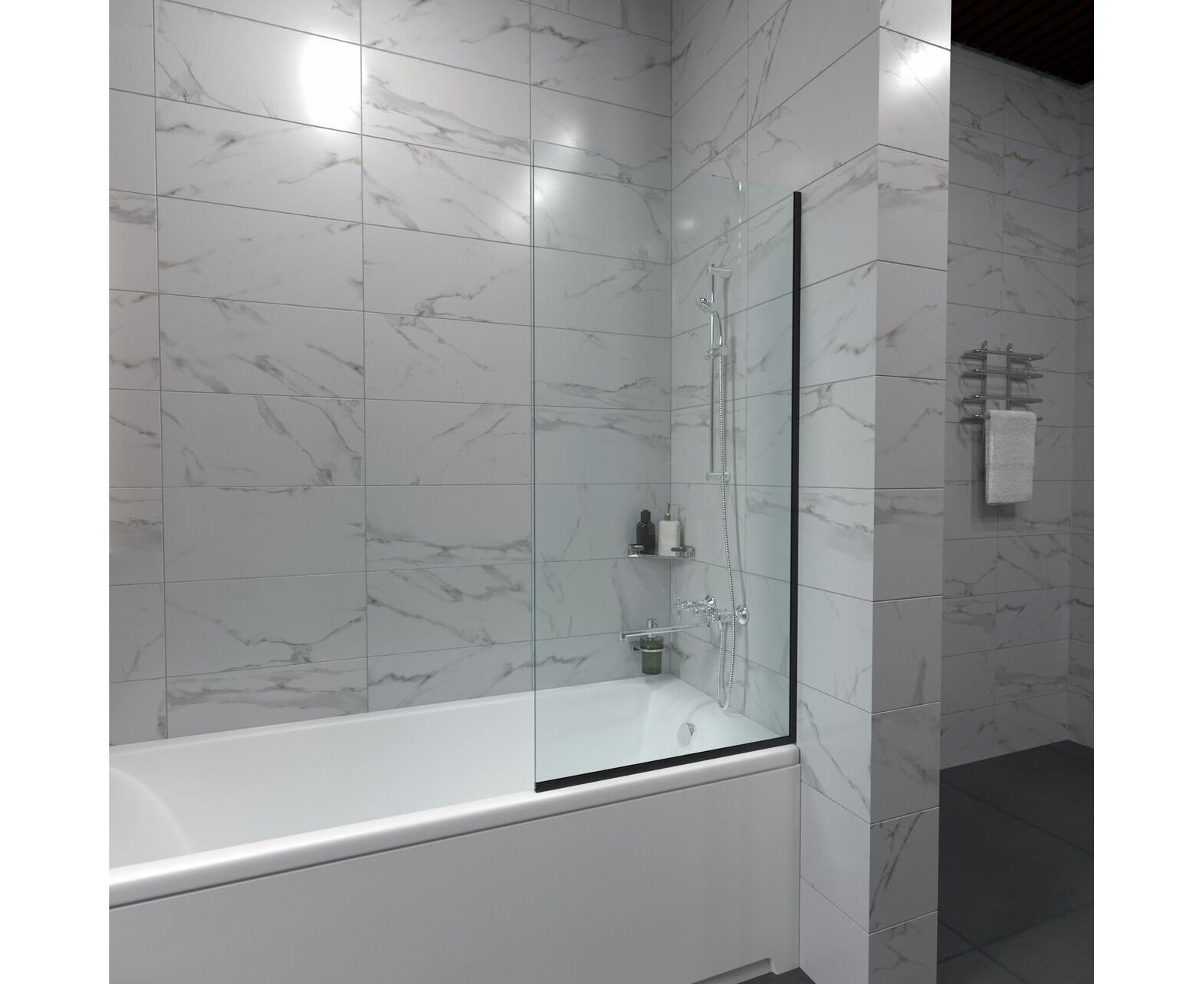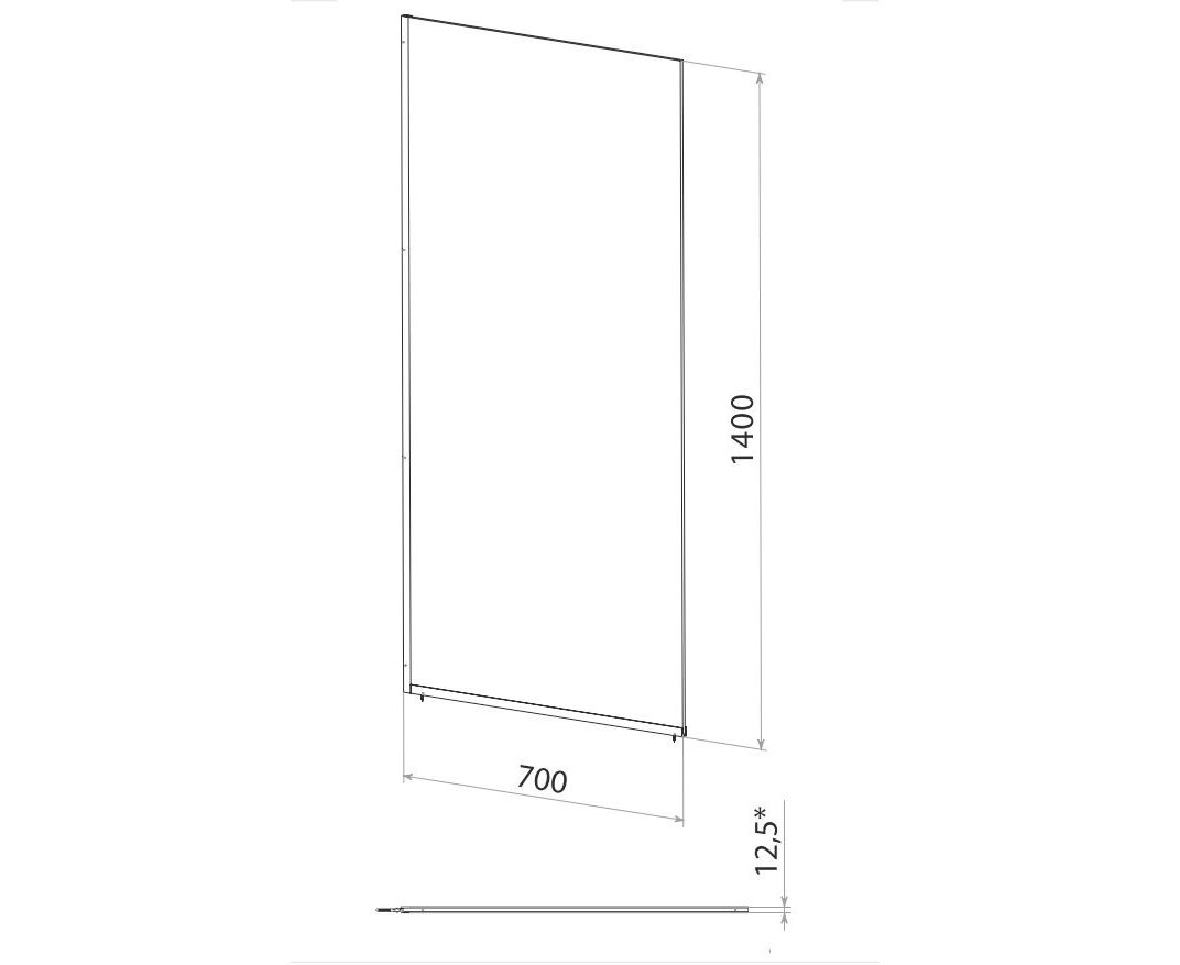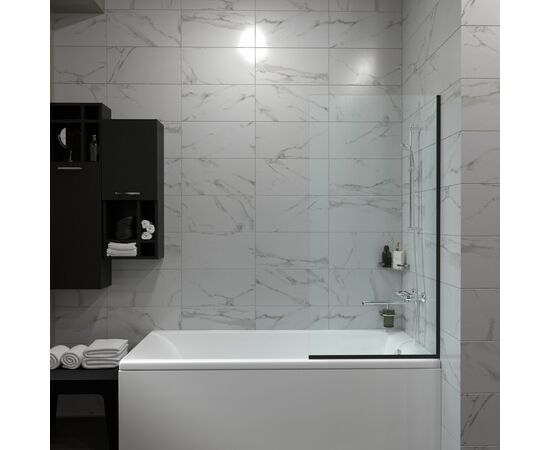 Регулируемая ширина: нет. Конструкция дверей: неподвижная. Исполнение полотна двери: прозрачное. Цвет полотна двери: прозрачное. Толщина полотна двери, мм: 8. Материал полотна двери: закаленное стекло. Материал профиля: алюминий. Цвет профиля: черный матовый. Монтаж: на ванну.