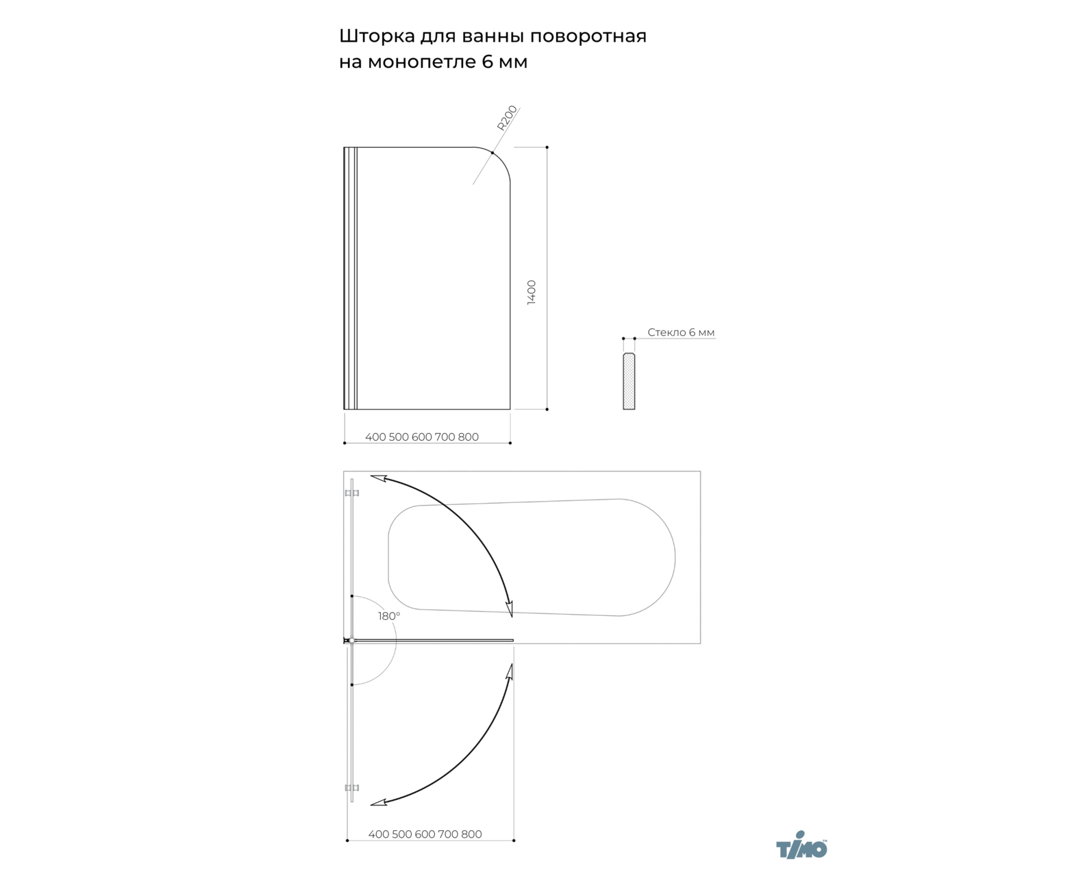 Характеристики Шторка для ванны Timo поворотная TCM-80/02F-6 на монопетле 1400х800 стекло матовое 6 мм