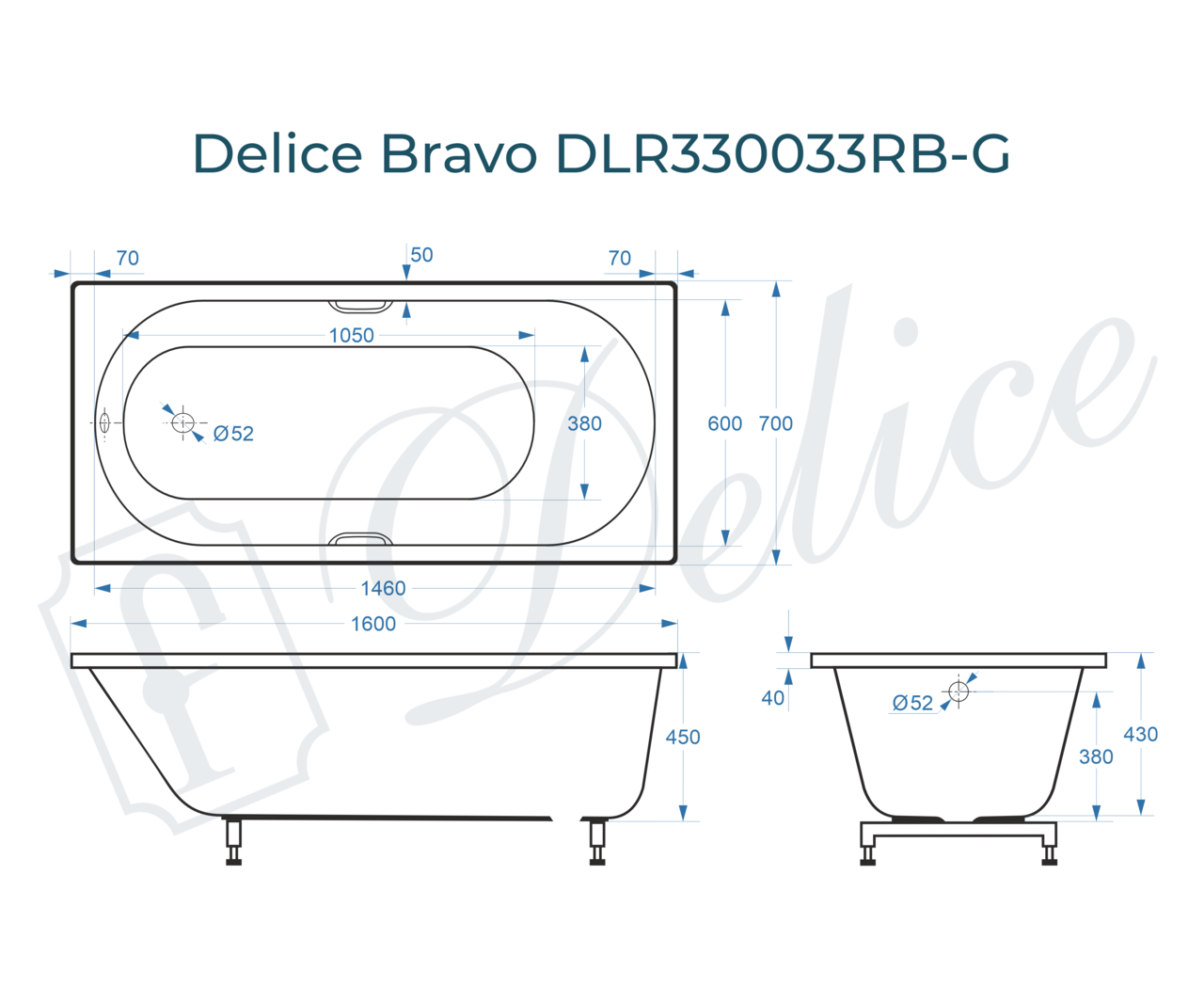 Размерный ряд ванны из литьевого мрамора Delice Bravo: 150х70, 160х70, 170х70, 170х75, 180х75, 180х80 и 190х90 см.