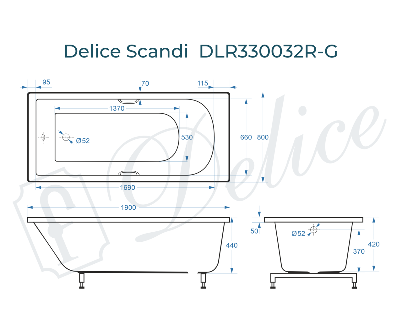 Размерный ряд ванны из литьевого мрамора Delice Scandi: 150х70, 160х70, 165х70, 170х70, 170х75, 170х80, 175х70, 180х70, 180х75, 180х80 и 190х80 см.