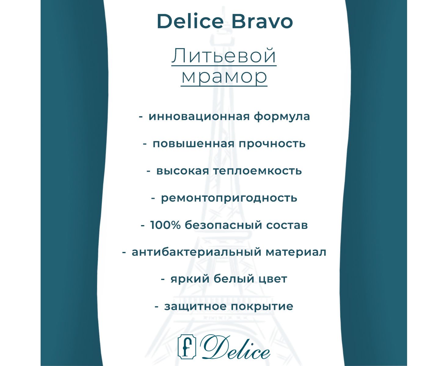 Литьевой мрамор Delice создан по инновационной передовой технологии. Для улучшения характеристик в состав добавляют модифицирующие компоненты, которые придают материалу уникальные свойства: