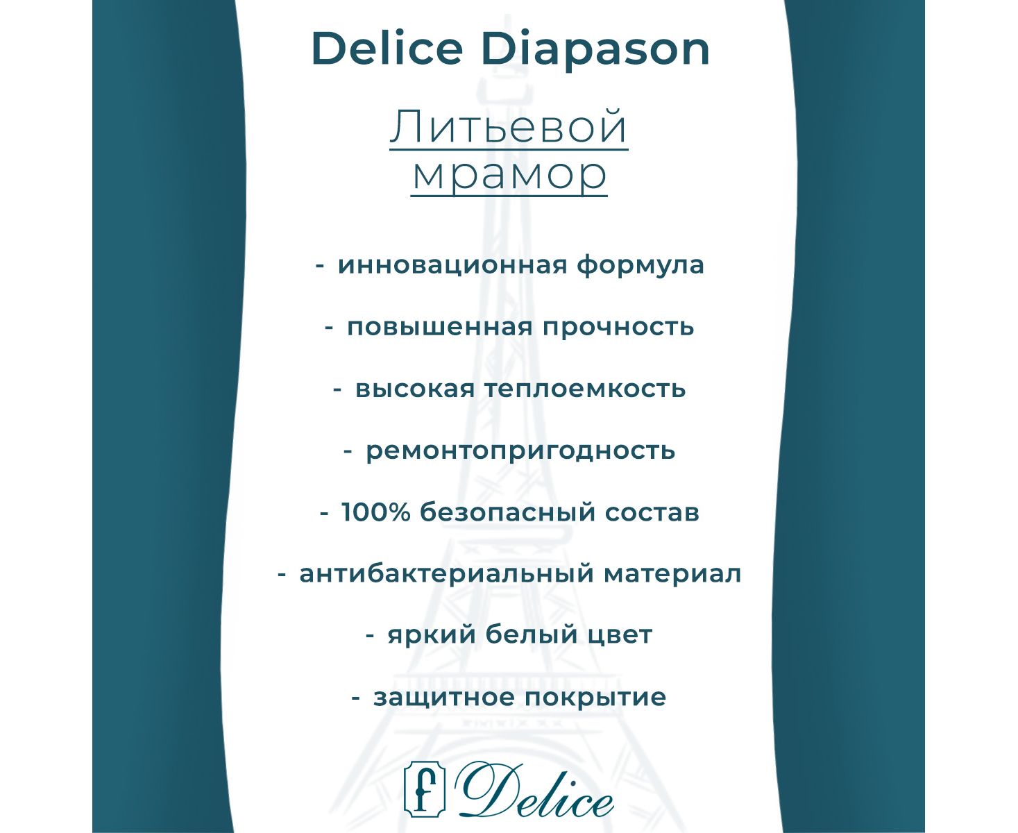 Литьевой мрамор Delice создан по инновационной передовой технологии. Для улучшения характеристик в состав добавляют модифицирующие компоненты, которые придают материалу уникальные свойства: