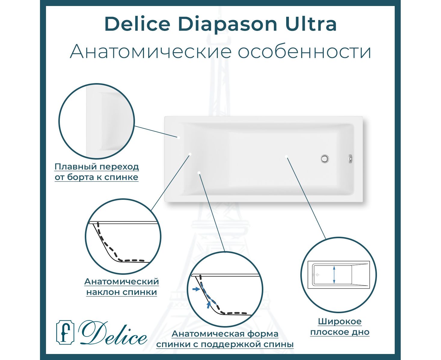 Описание ванны из литьевого мрамора Delice Diapason Ultra с узким бортом 160х70 глянцевая с ручками Хром