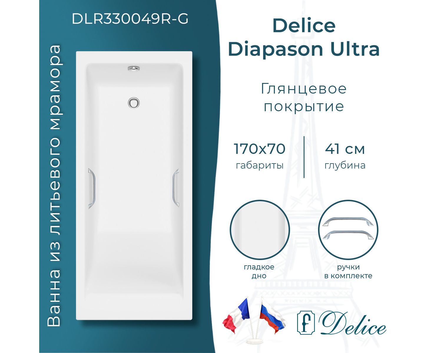 Описание ванны из литьевого мрамора Delice Diapason Ultra с узким бортом 170х70 глянцевая с ручками Хром