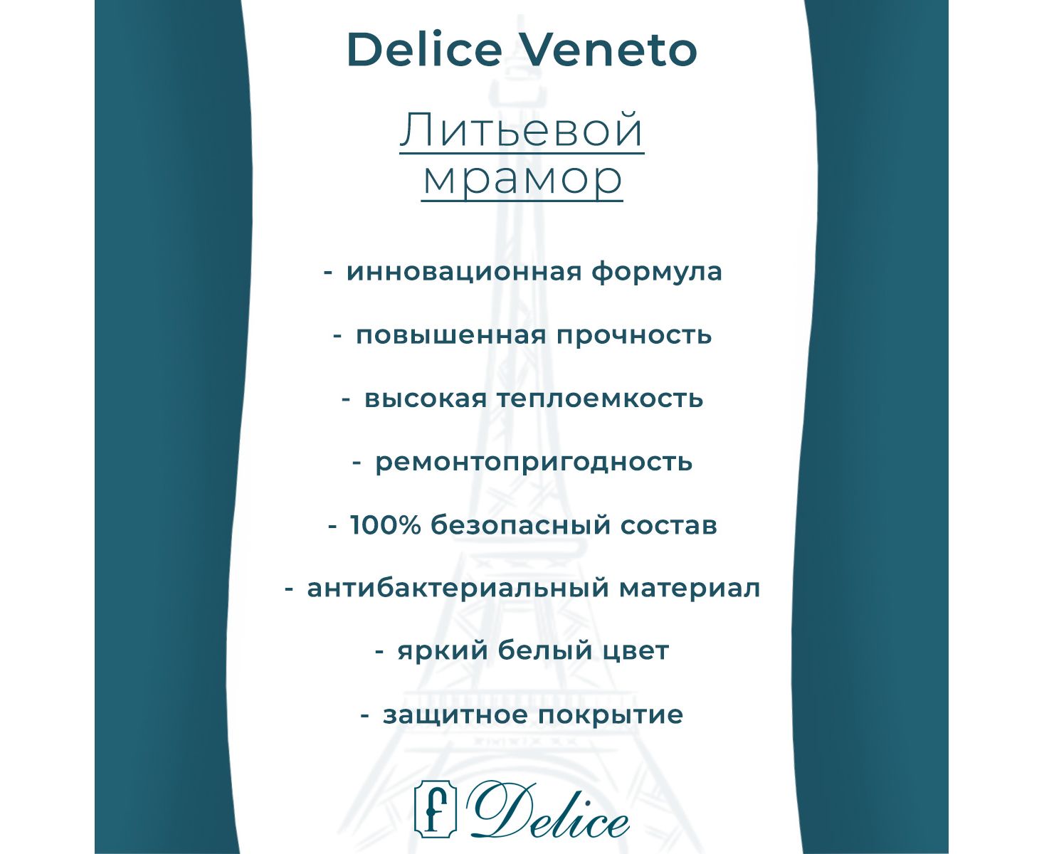 Литьевой мрамор Delice создан по инновационной передовой технологии. Для улучшения характеристик в состав добавляют модифицирующие компоненты, которые придают материалу уникальные свойства: