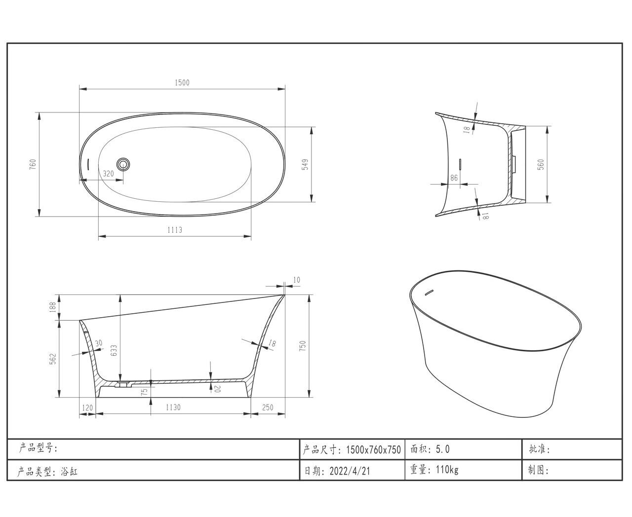 Характеристики Ванна Timo solid KIARA1500 1500х760х750